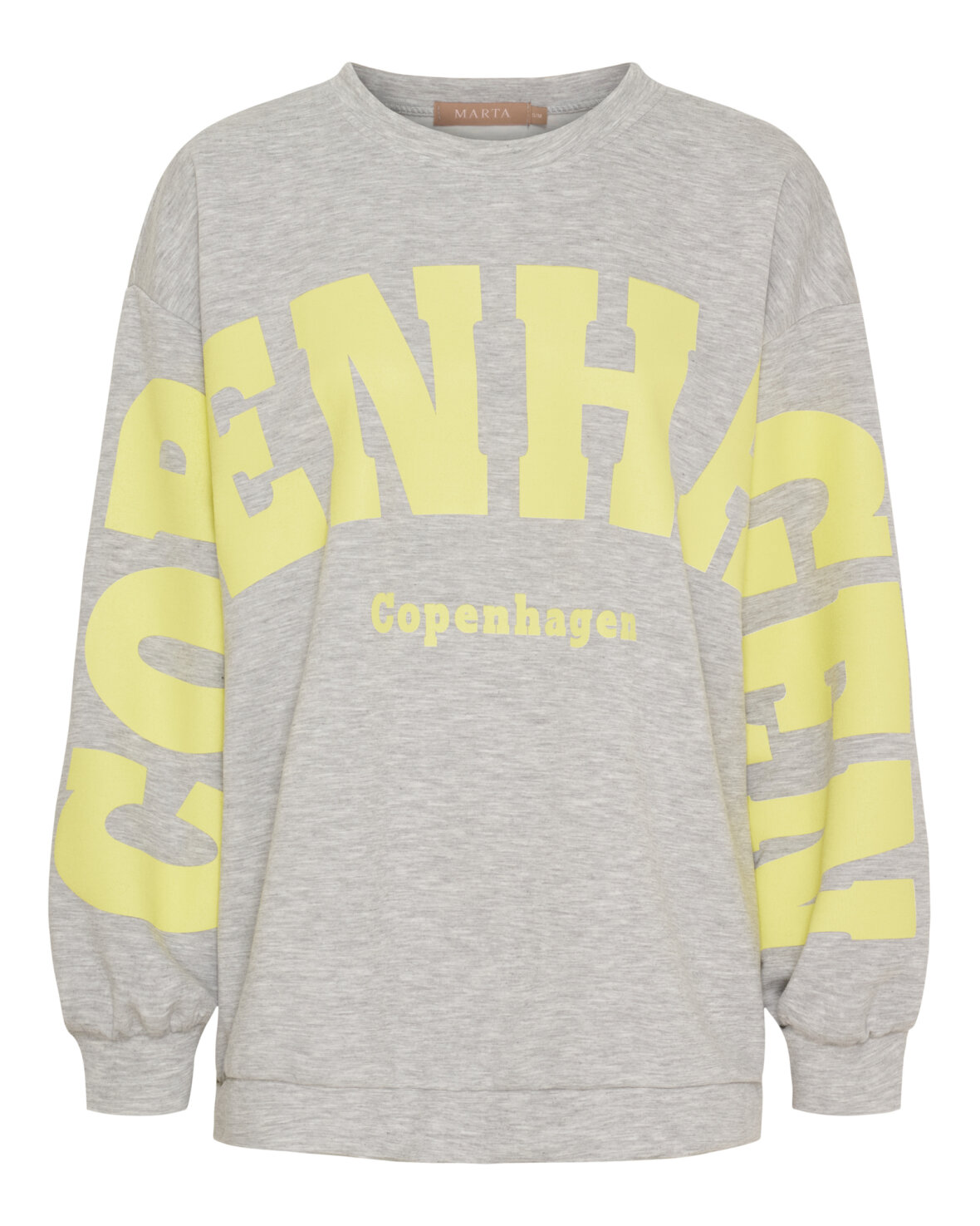 Sweatshirt 22659 fra Marta Du Chateau i grå med gul. Blød og lækker sweatshirt med smart COPENHAGEN skrevet henover bryst og arme. Let oversize i størrelsen.