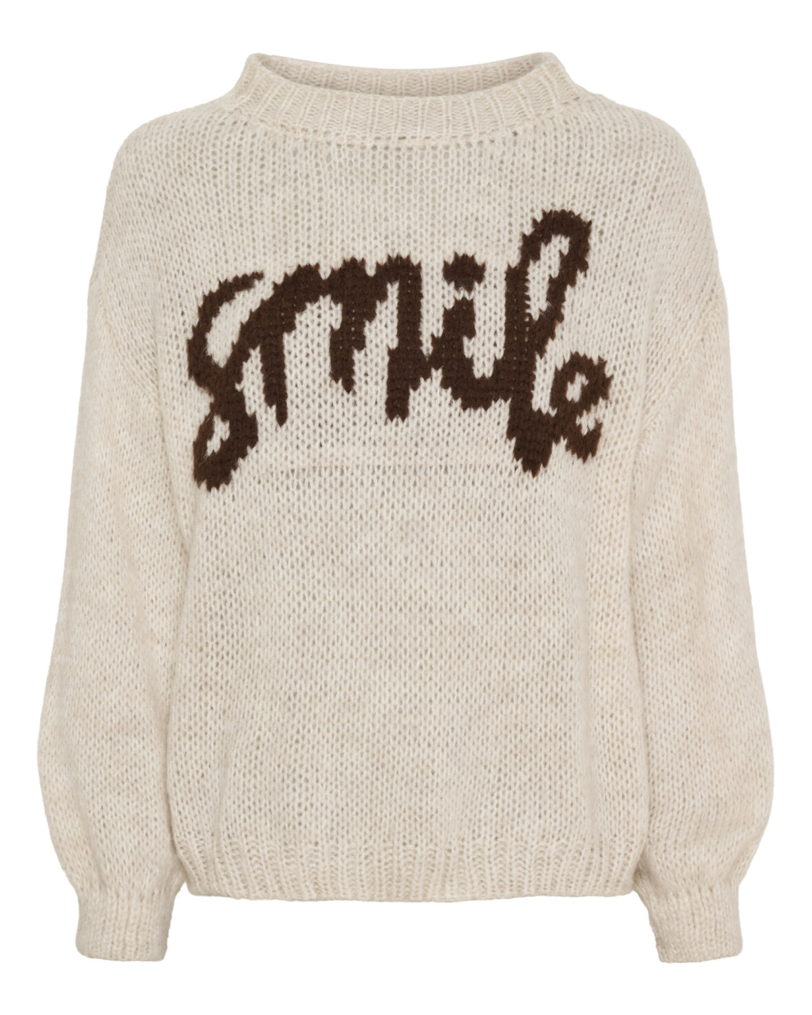 Strik 9580 fra Marta Du Chateau i beige. Lækker strik med rund hals, lange ærmer og SMILE på fronten.