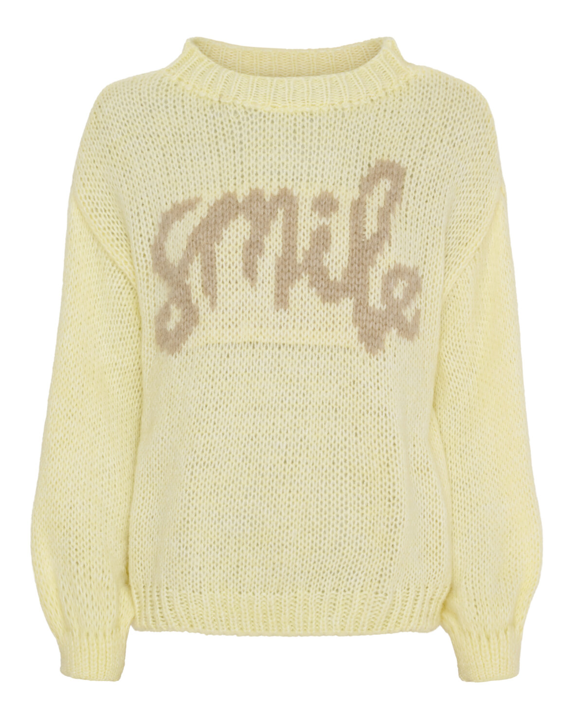 Strik 9580 fra Marta Du Chateau i gul. Lækker strik med rund hals, lange ærmer og SMILE på fronten.