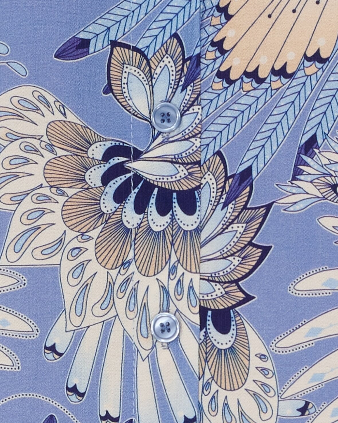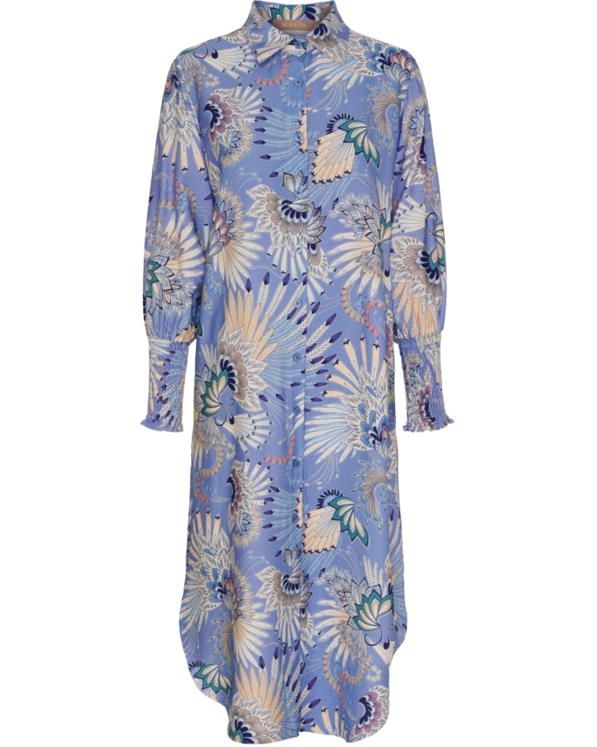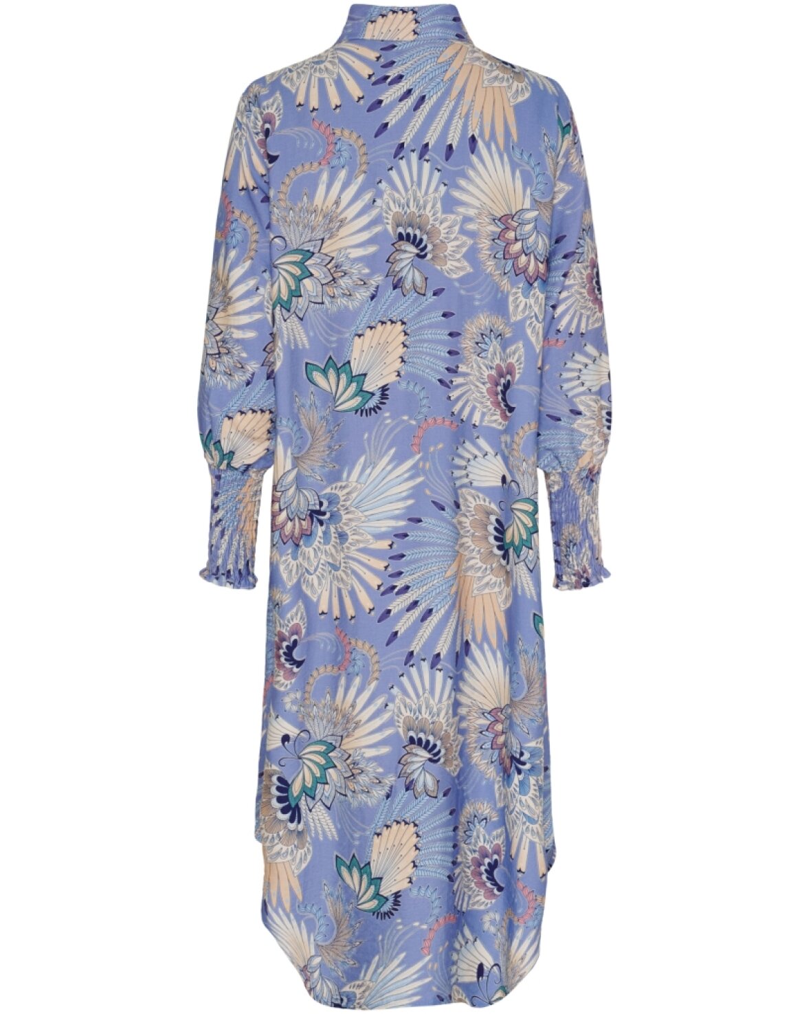 Kjole 7617 fra Marta Du Chateau i lyseblå med et lækkert mønster. Skøn kjole med kina krave, lange ærmer der slutter med smock. Gennem knappet så den både kan bruges som kjole og/eller cardigan.