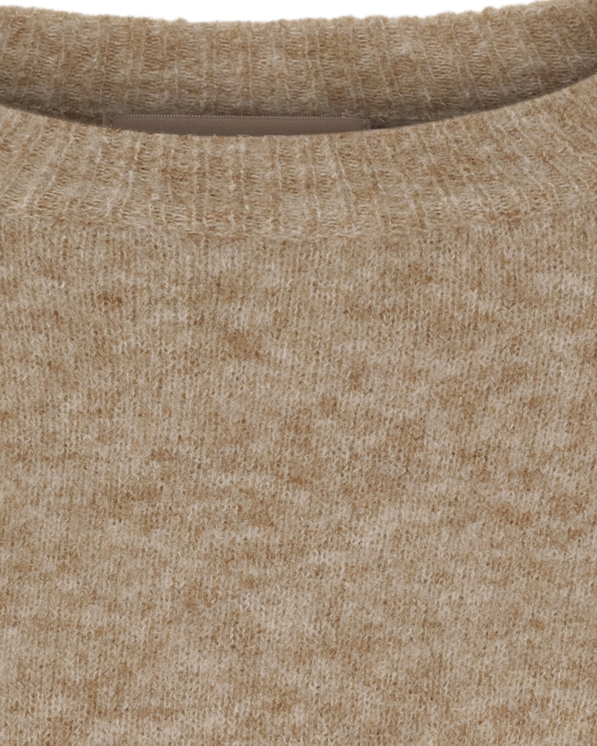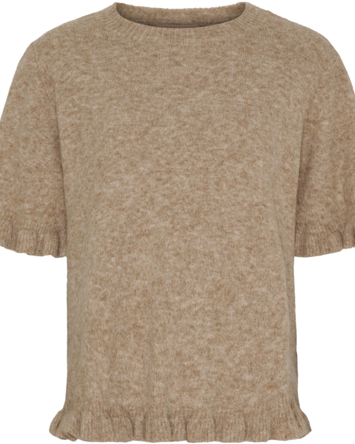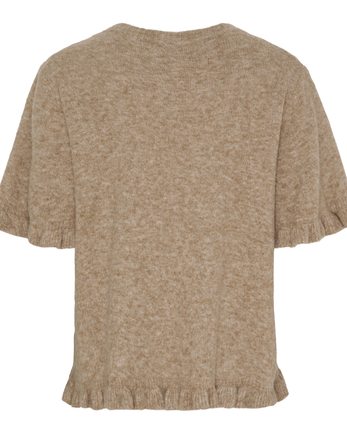 Strik KN8129 fra Marta Du Chateau i fango. Skøn strik med rund hals, fint kort ærme med flæse og fin flæse nederst på strik.