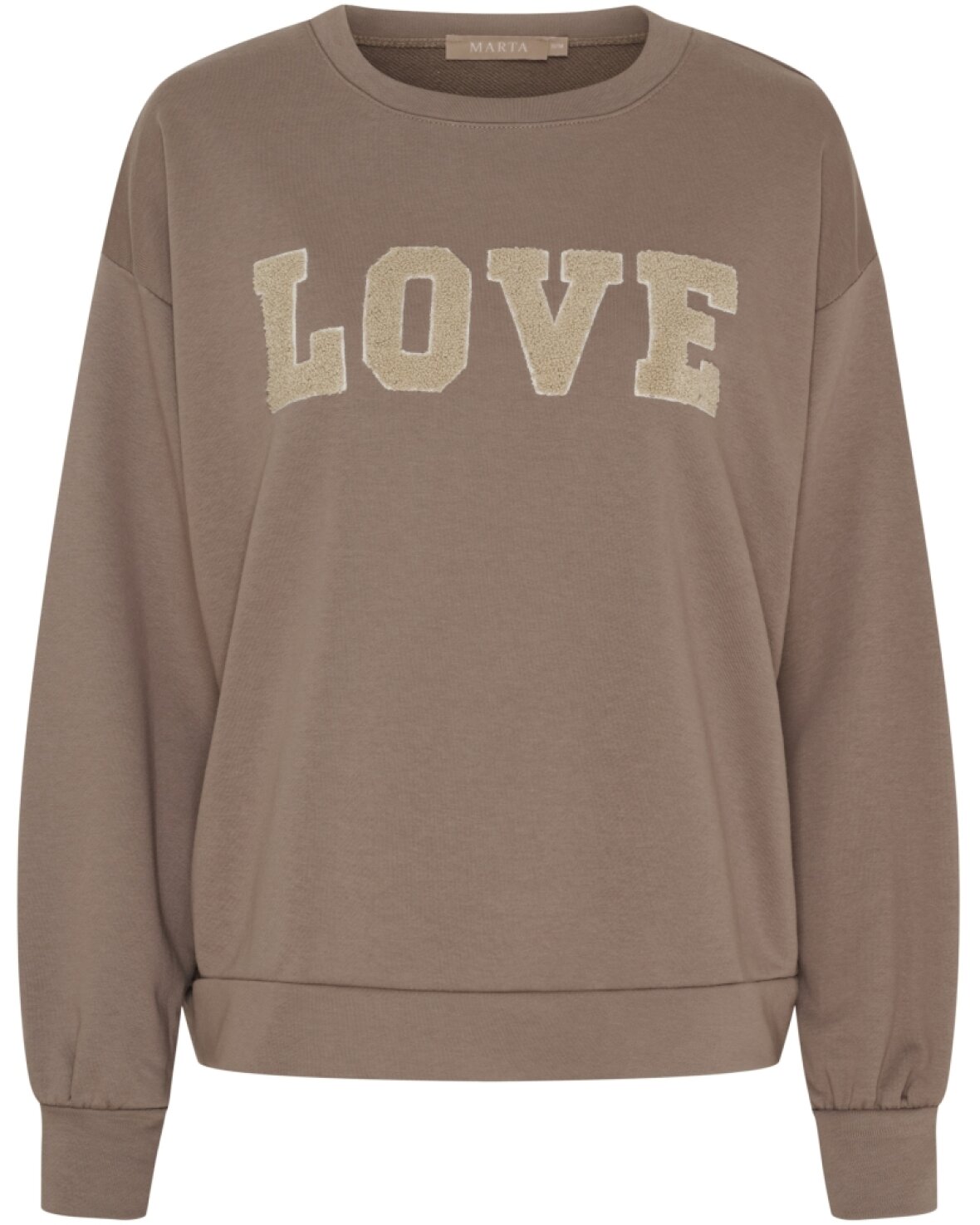 Sweatshirt 7976 fra Marta Du Chateau i fango med creme LOVE skrift. Skøn sweatshirt med rund hals, lange ærmer og blød og lækker.