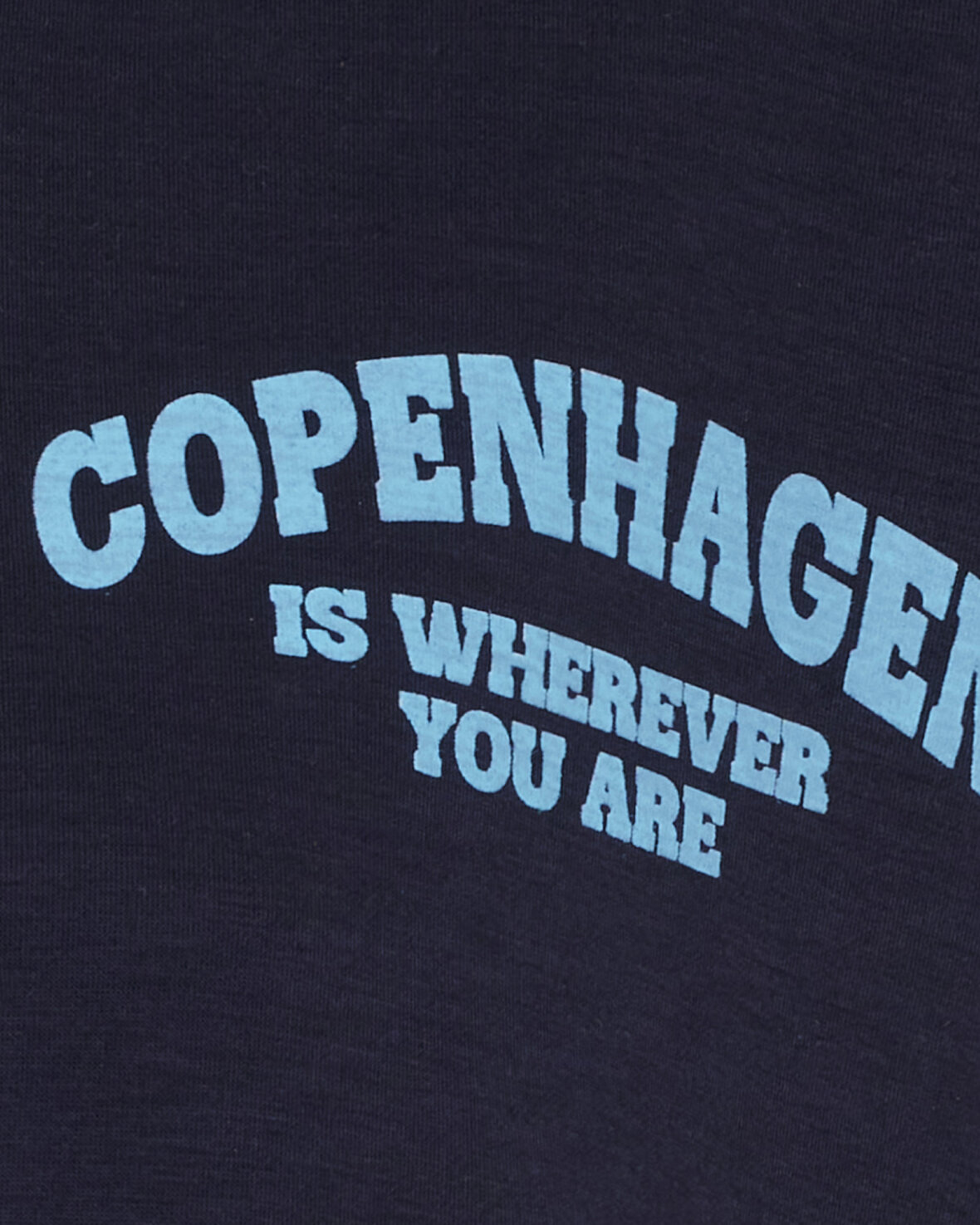 Cardigan 22669 fra Marta Du Chateau navy med lyseblå skrift. Fed sweatshirt cardigan med høj hals , lange ærmer, gennemgående lynlås og elastik forneden. Stort COPENHAGEN tryk bagpå.