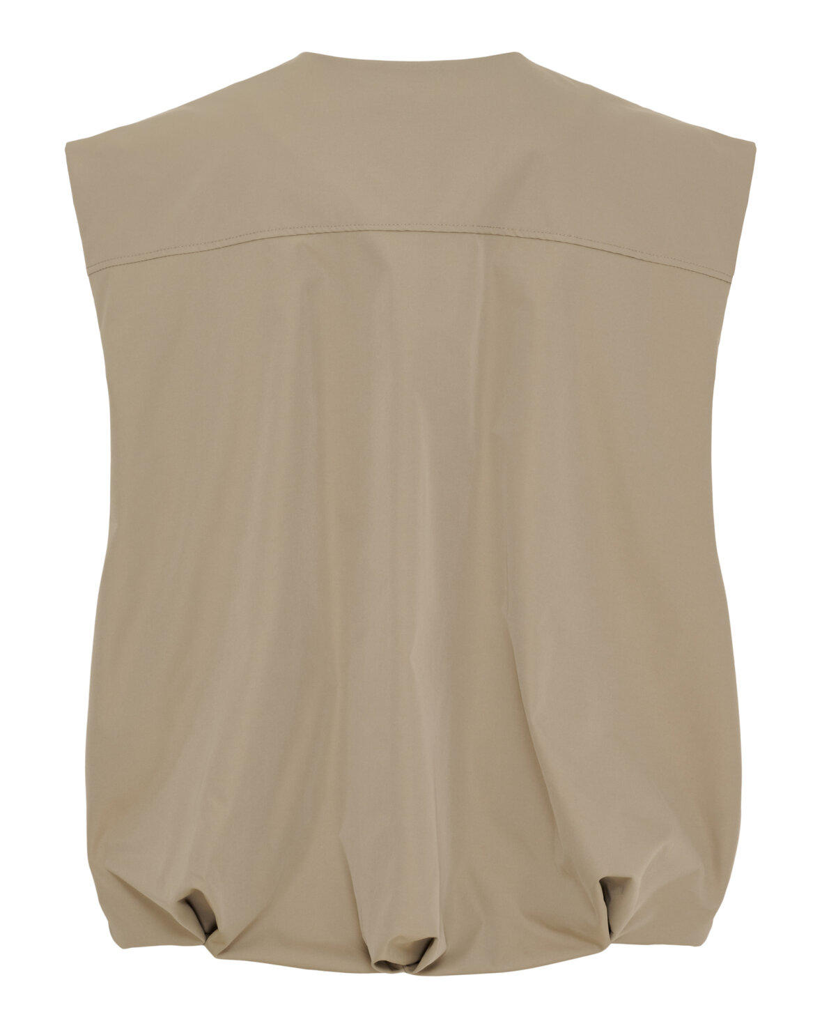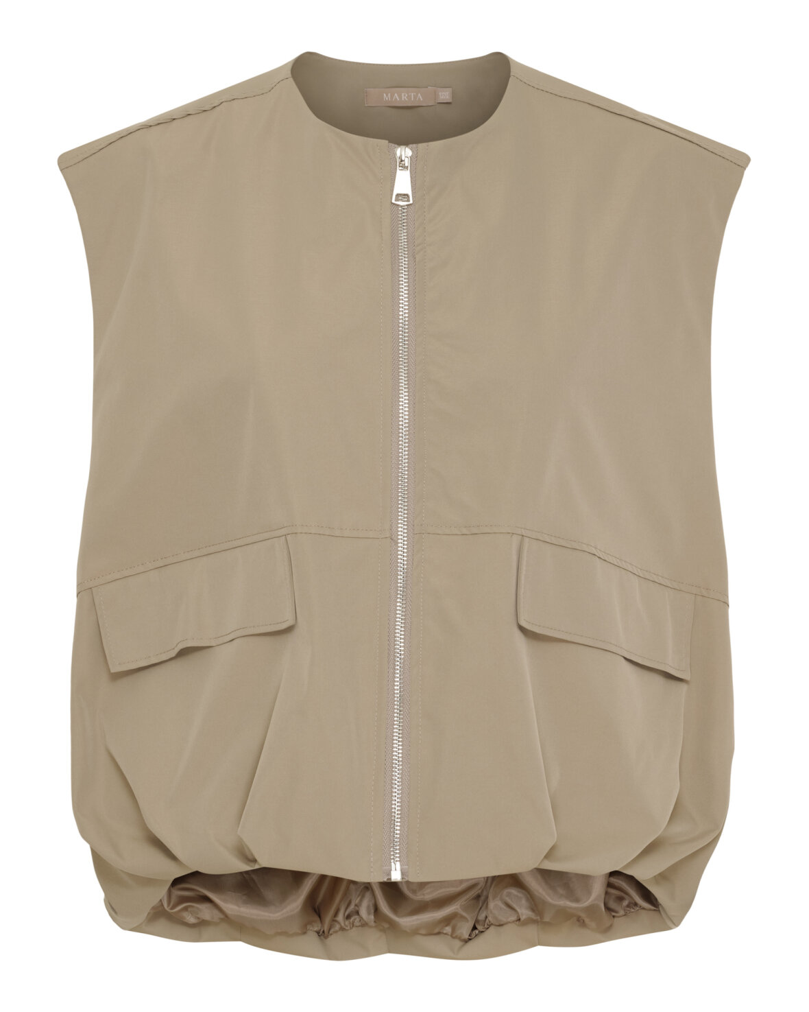 Vest 55009 fra Marta Du Chateau i mørk beige. Smart vest mdc rund hals, lynlås ned foran og front lommer. Vesten har ballon fald forneden.