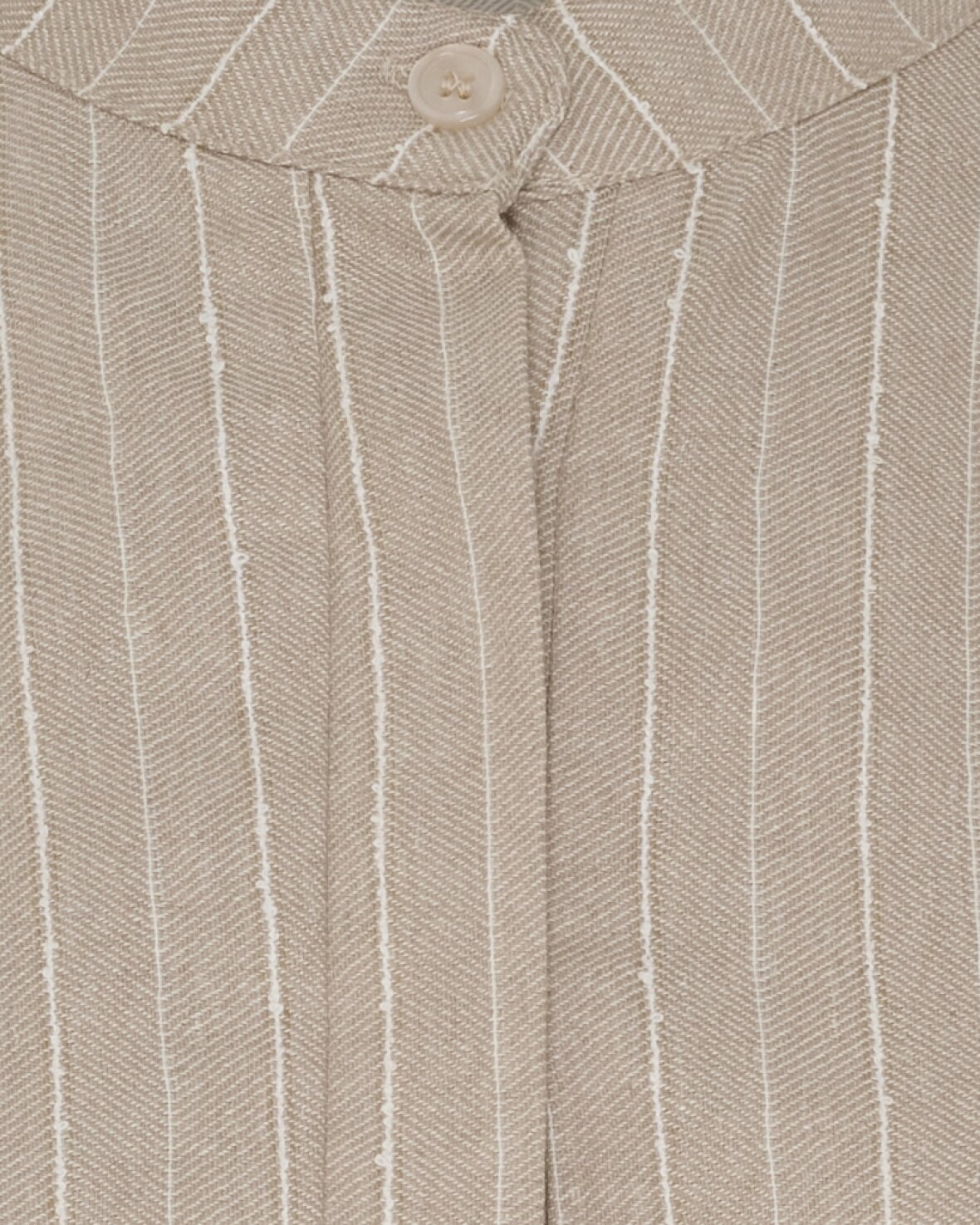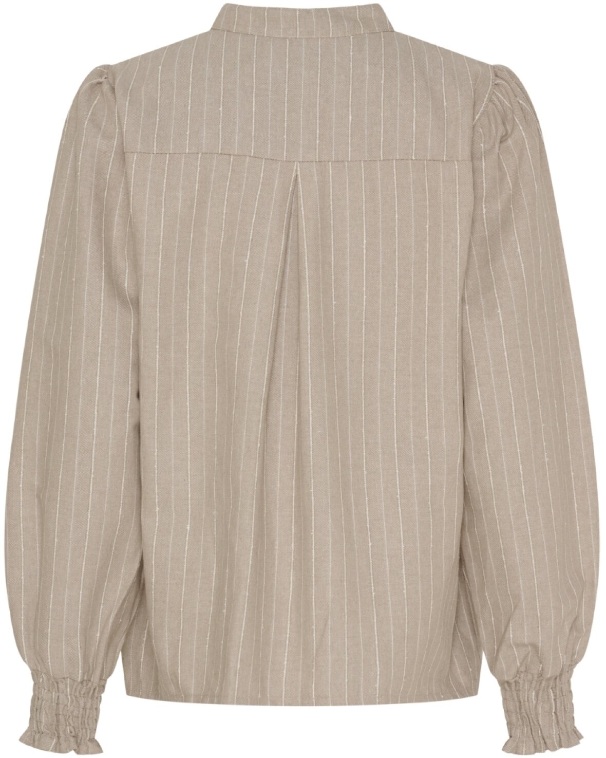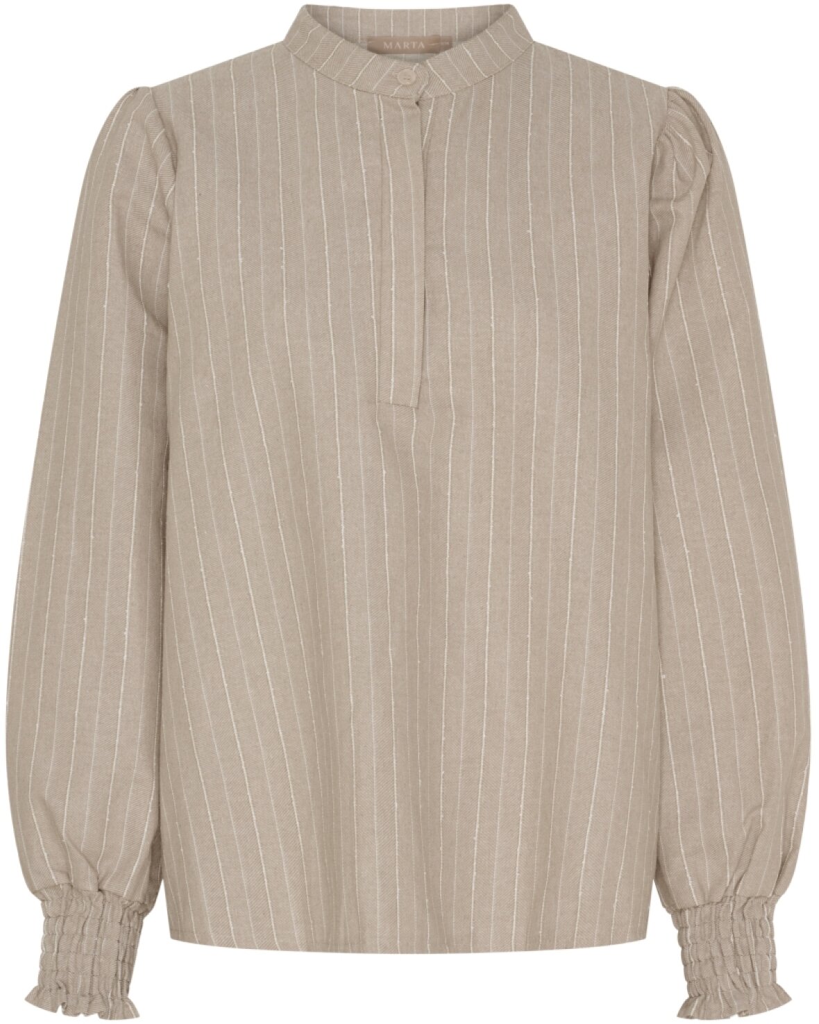 Bluse 7913 fra Marta Du Chateau i sand med nålestriber. Skøn bluse ned kina krave, stolpelukning ned til brystet, lange ærmer der lukkes med knap.