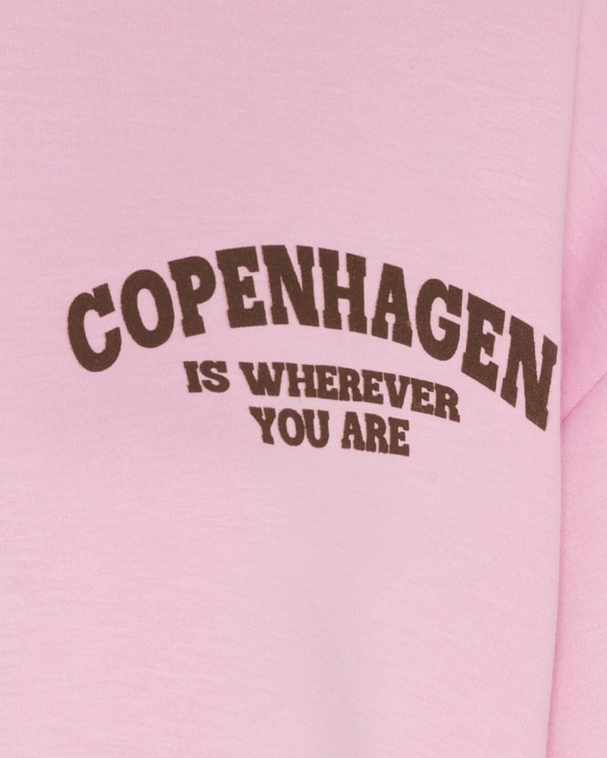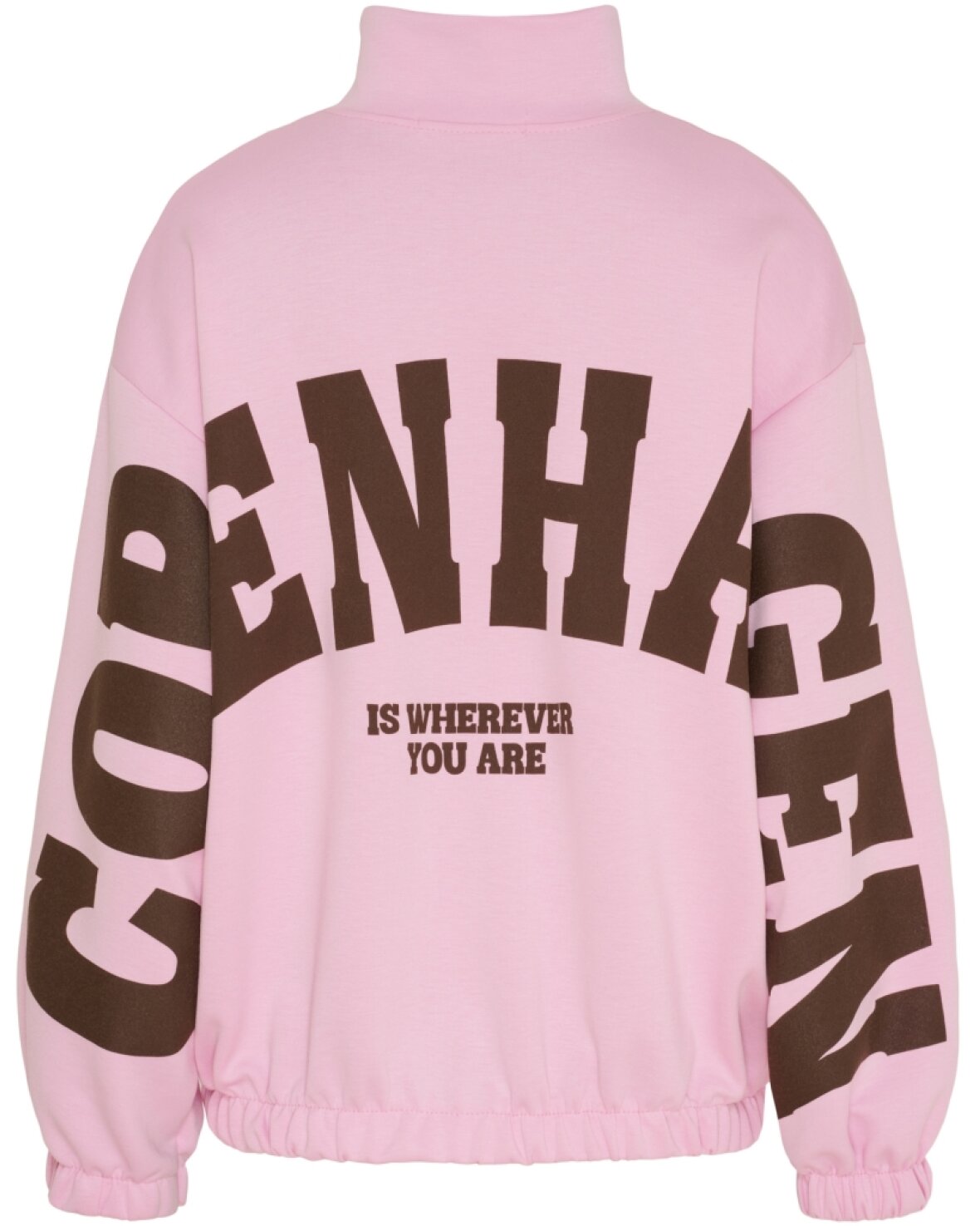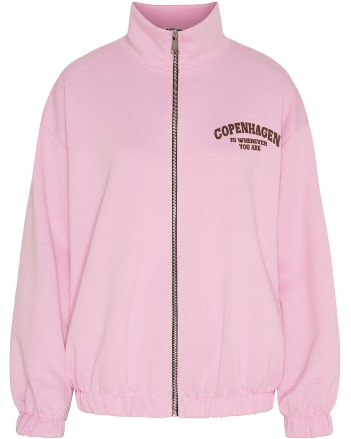 Cardigan 22669 fra Marta Du Chateau pink med brun skrift. Fed sweatshirt cardigan med høj hals , lange ærmer, gennemgående lynlås og elastik forneden. Stort COPENHAGEN tryk bagpå.