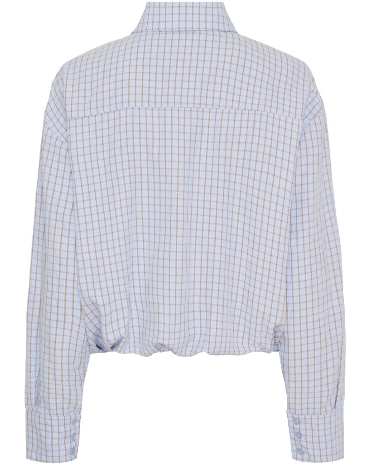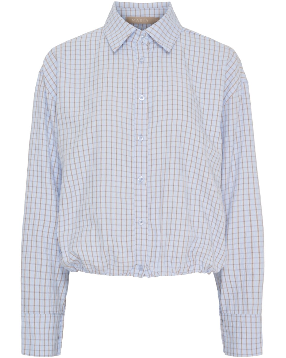 Skjorte 58771 fra Marta Du Chateau i lyseblå med små tern i brun. Skøn skjorte med klassisk krave, lange ærmer. Denne skjorte har elastik forneden. Super fin detalje og sætter sig pænt.