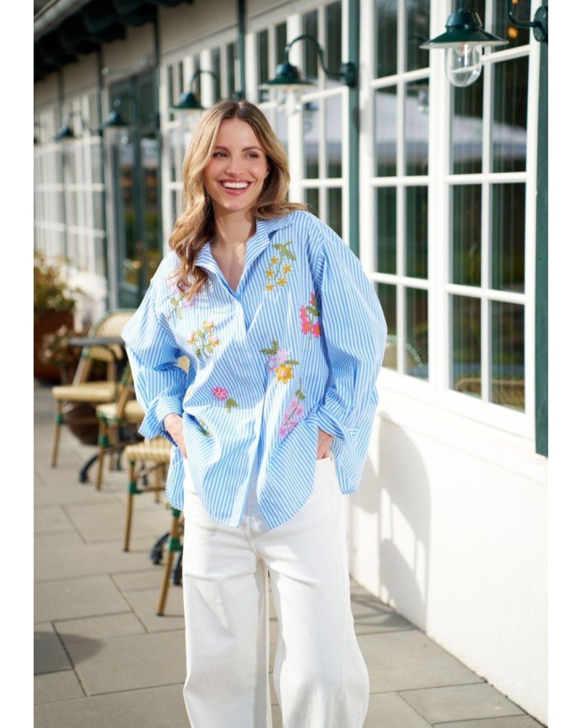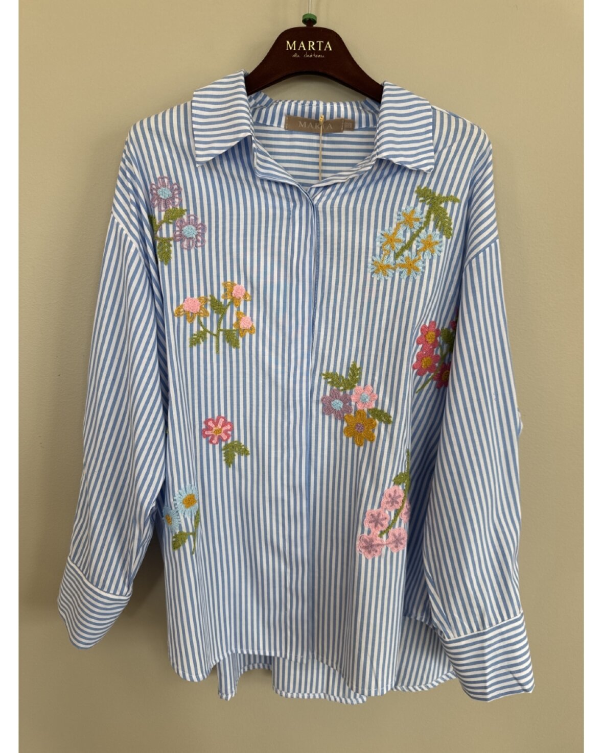 Skjorte 269113 fra Marta Du Chateau i blå med striber og smukke blomster broderet på. Skjorten har klassisk krave, er gennemknappet og med lange ærmer.