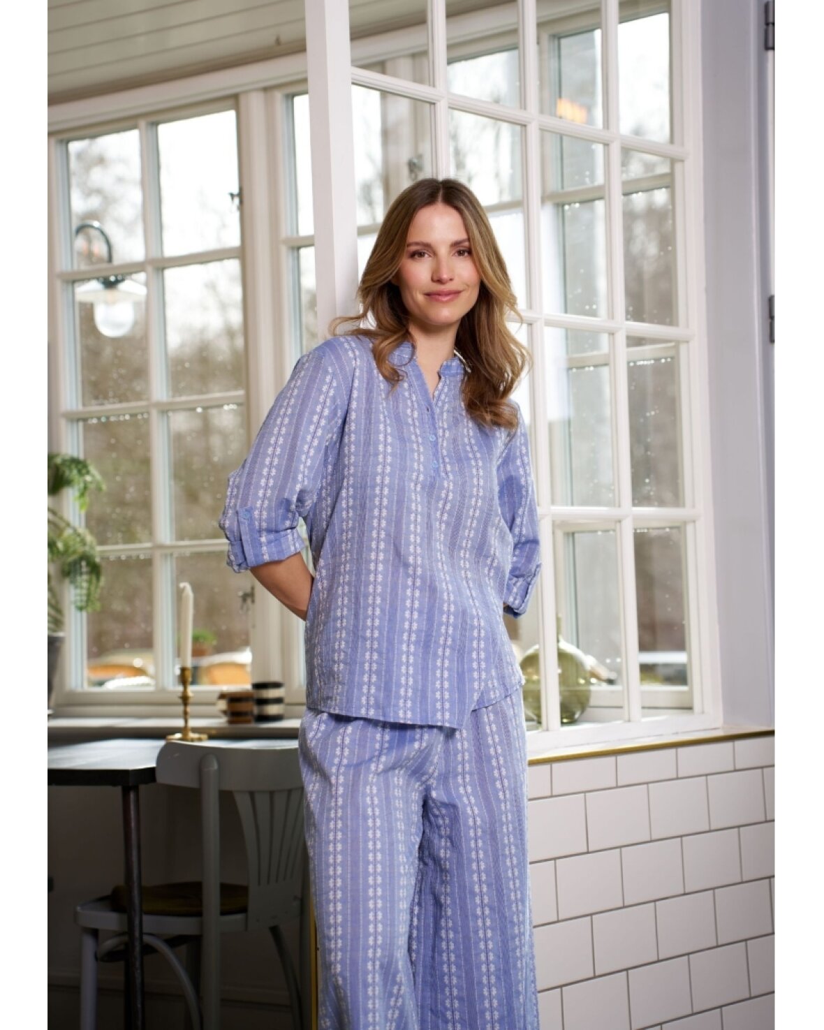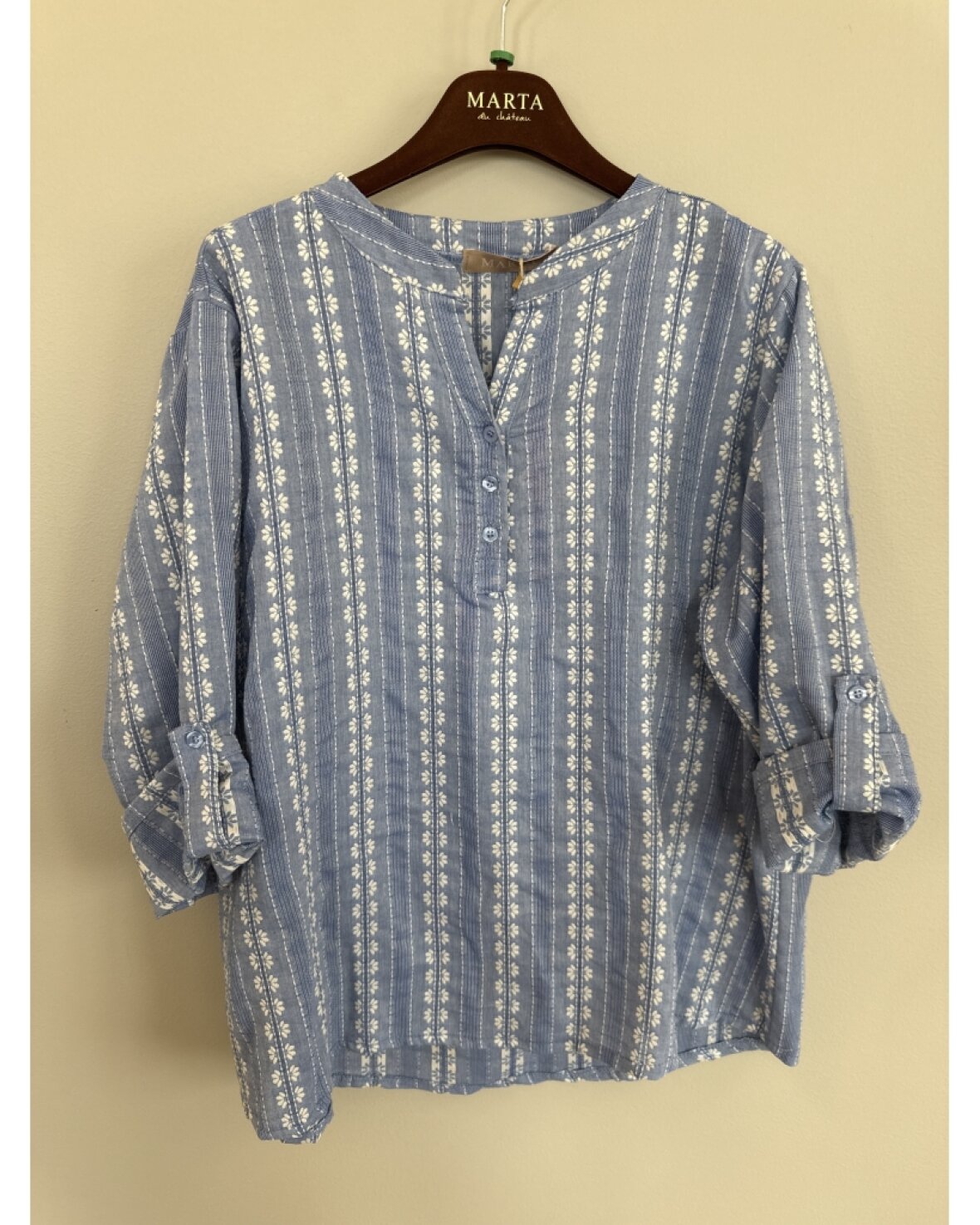 Skjorte 58829 fra Marta Du Chateau i blå med kina krave, v-udskæring og 3 knapper ned. 3/4 langt ærme med mulighed for at knappe op.
