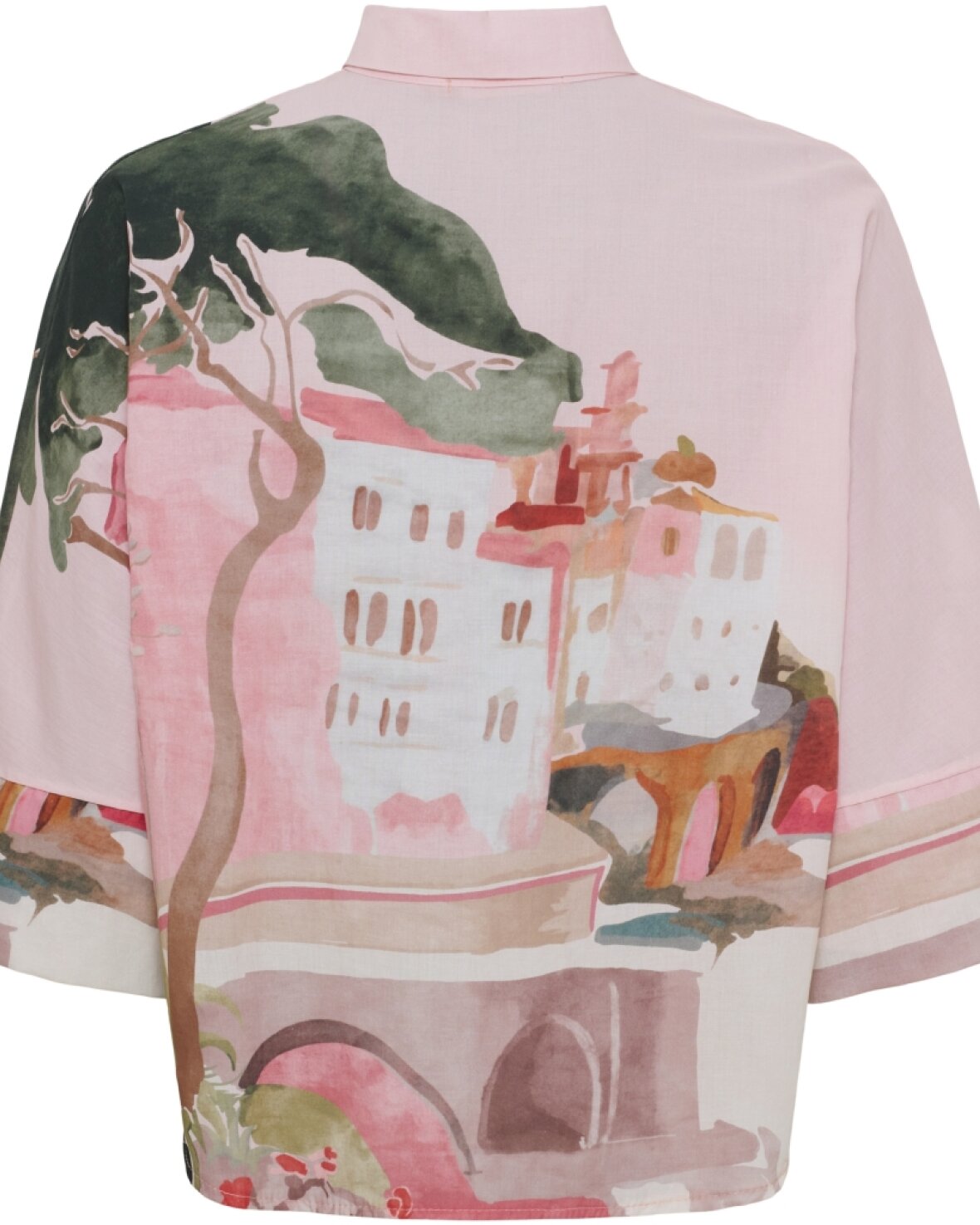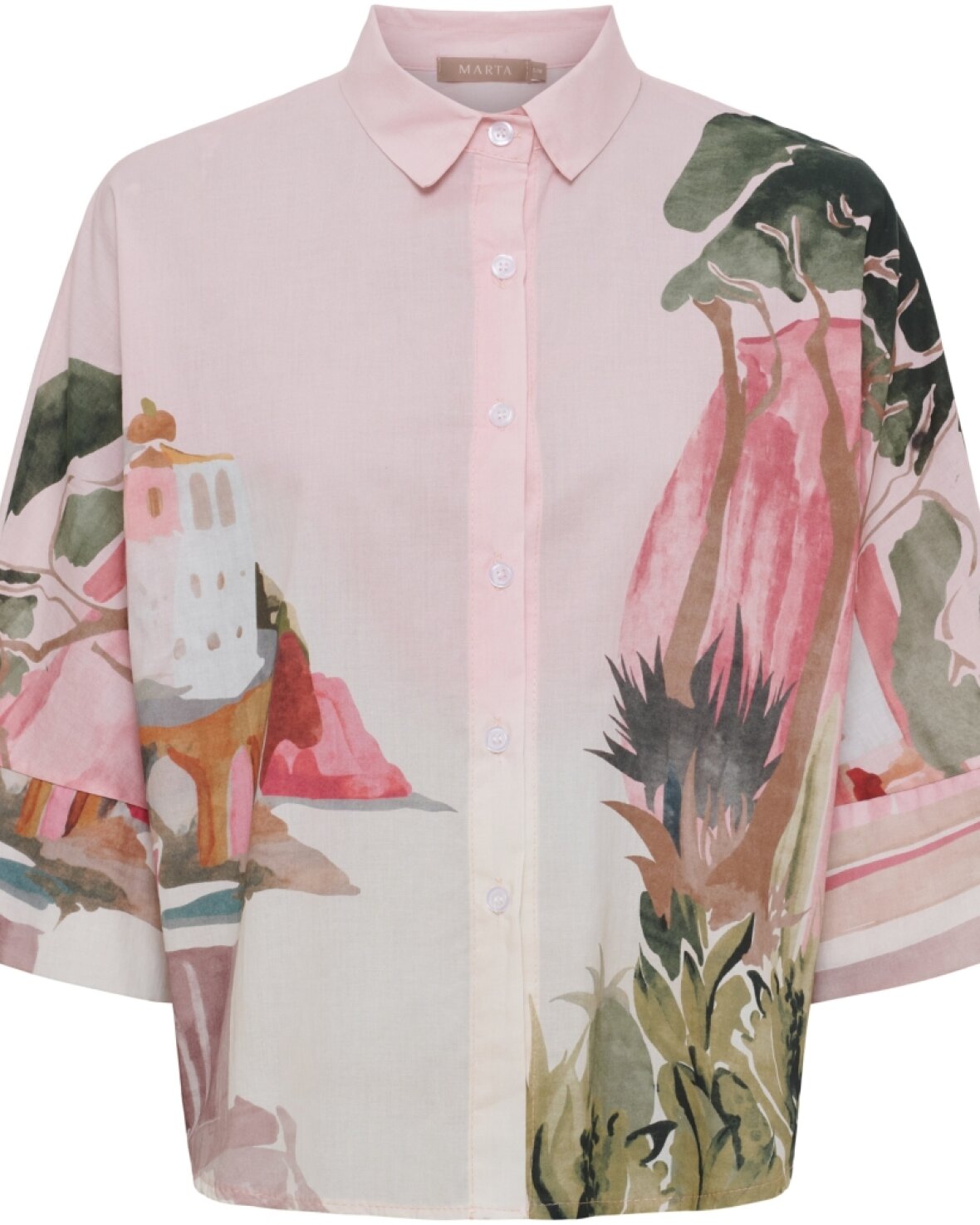 Skjorte 268386 fra Marta Du Chateau i pink med et skønt print. Skjorte er gennemknappet, har klassisk krave og 3/4 lange ærmer. Skjorten runder desuden let forneden.