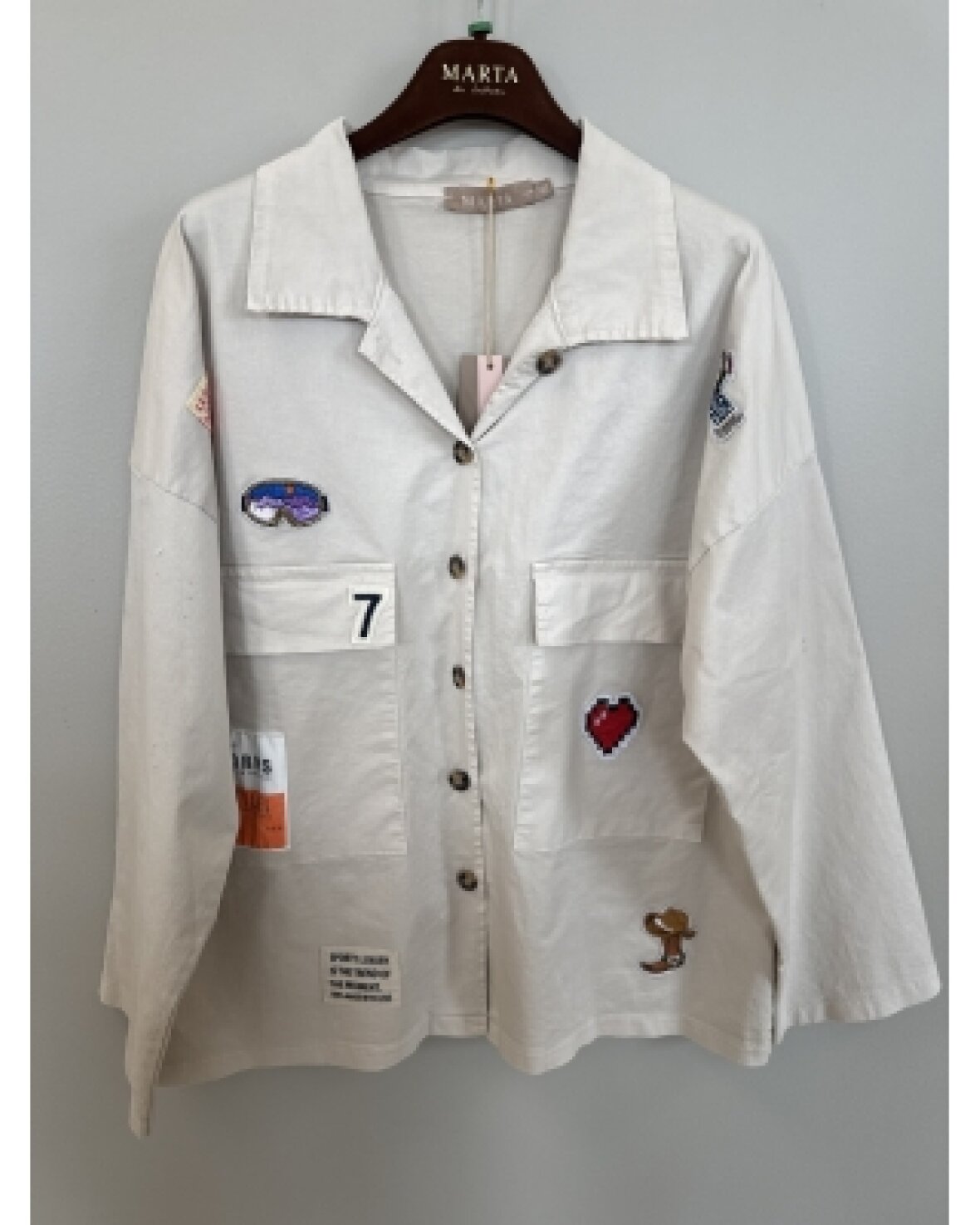Jakke 8122 fra Marta Du Chateau i beige med super cool badges på fronten. Jakken/skjorten er gennemknappet, med krave og 2 store front lommer.