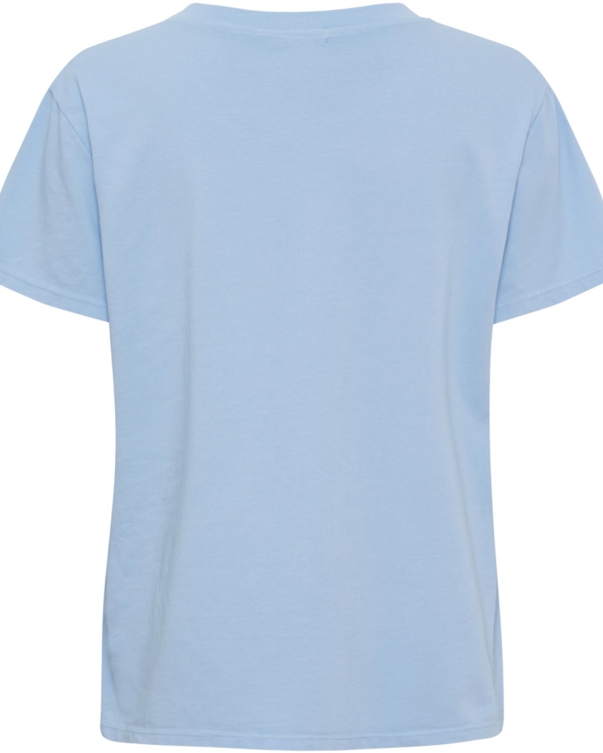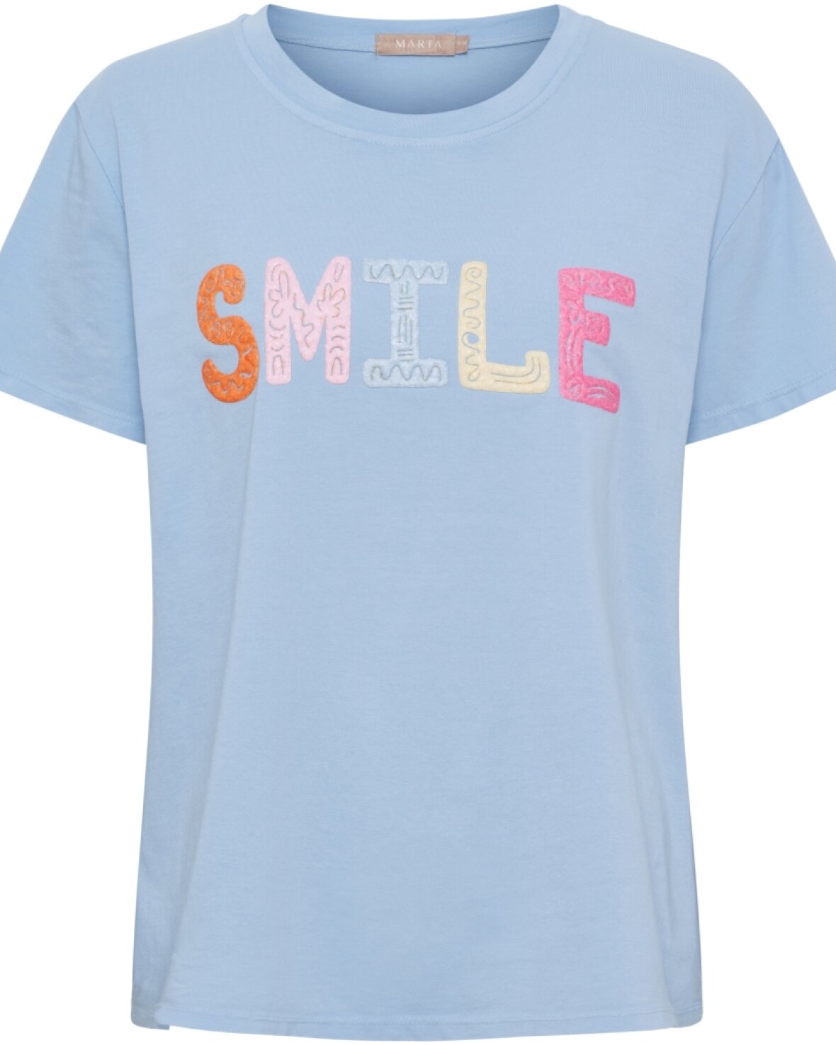T-shirt 22585 fra Marta Du Chateau i lyseblå. Skøn t-shirt med rund hals og et fint ærme. Den er let boxet i modellen og så fin med sin SMILE på fronten.