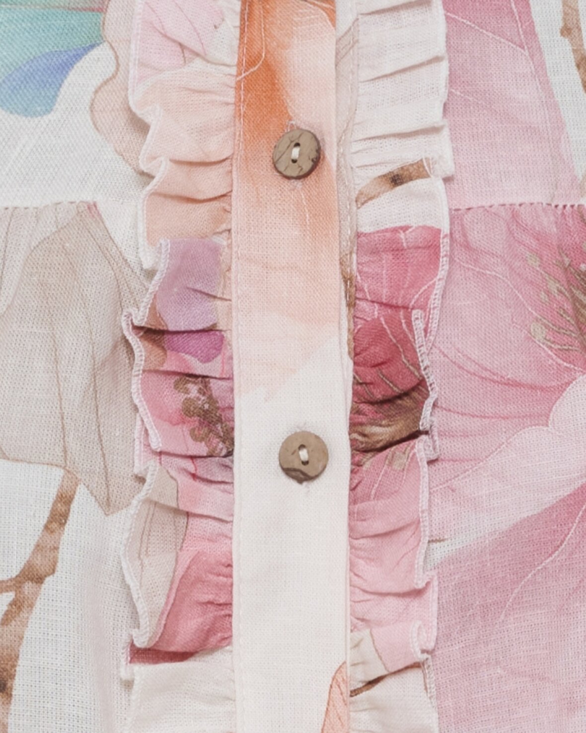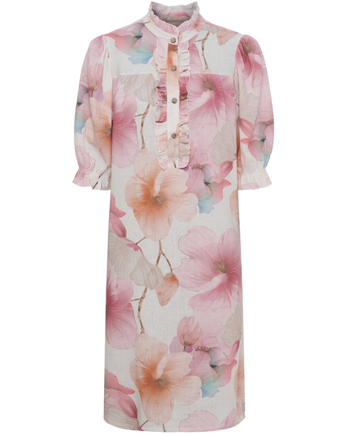 Kjole 269112 Marta Du Chateau creme med skønt print af blomster. Kjolen har kina krave, knaplukning ned til under brystet, kalvekrøs og et fint ærme.