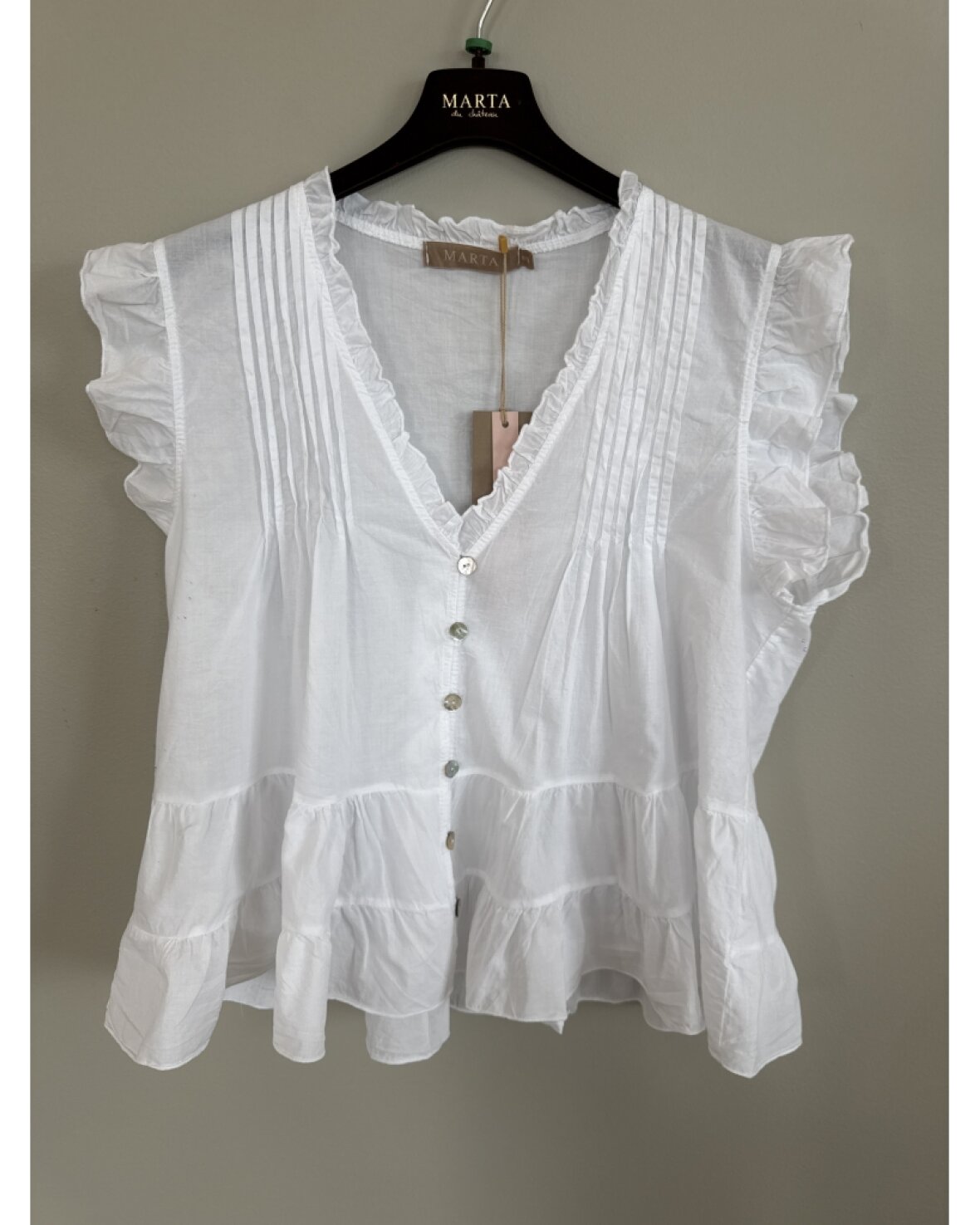 Top 68181 fra Marta Du Chateau i hvid. Skøn top med v-udskæring, knapper ned foran og søde detaljer.