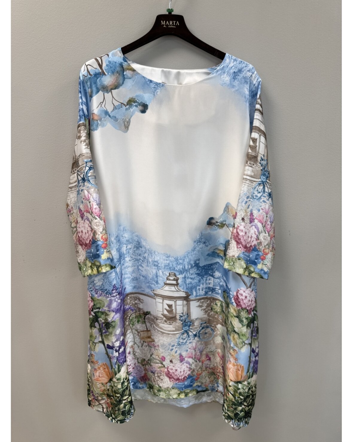 Kjole 7872 fra Marta Du Chateau i lyseblå. Smukkeste kjole med et flot print. Kjole har A-facon, 3/4 lange ærmer og rund hals.
